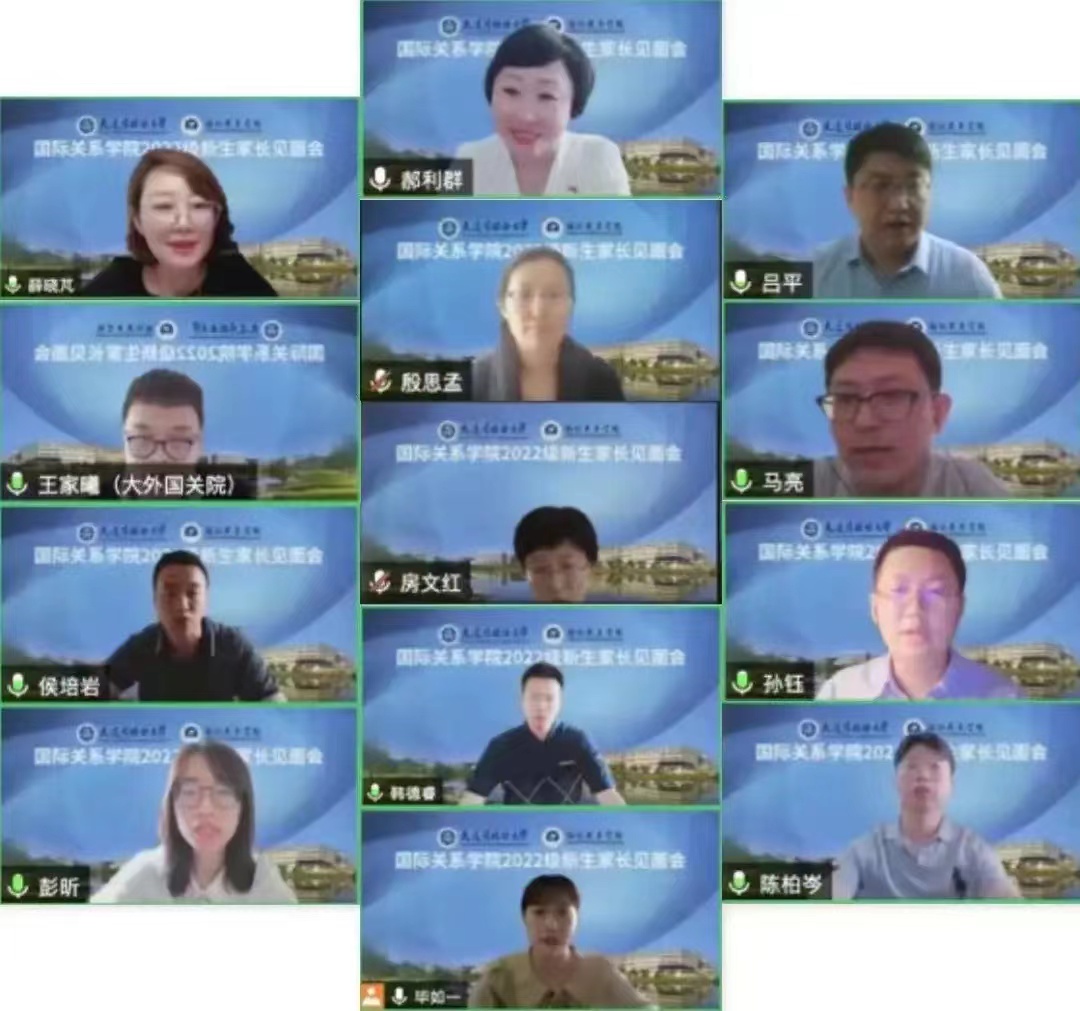 直属党支部书记郝利群、院长薛晓芃、副院长吕平、国际事务与国际关系专业教研室主任王家曦、外交学专业教研室主任殷思孟、专职组织员马亮、分团委书记侯培岩、教师房文红、孙钰、韩德睿、彭昕、陈柏岑出席本次会议。会议由2022级辅导员毕如一主持,全体新生及家长参与此次会议。