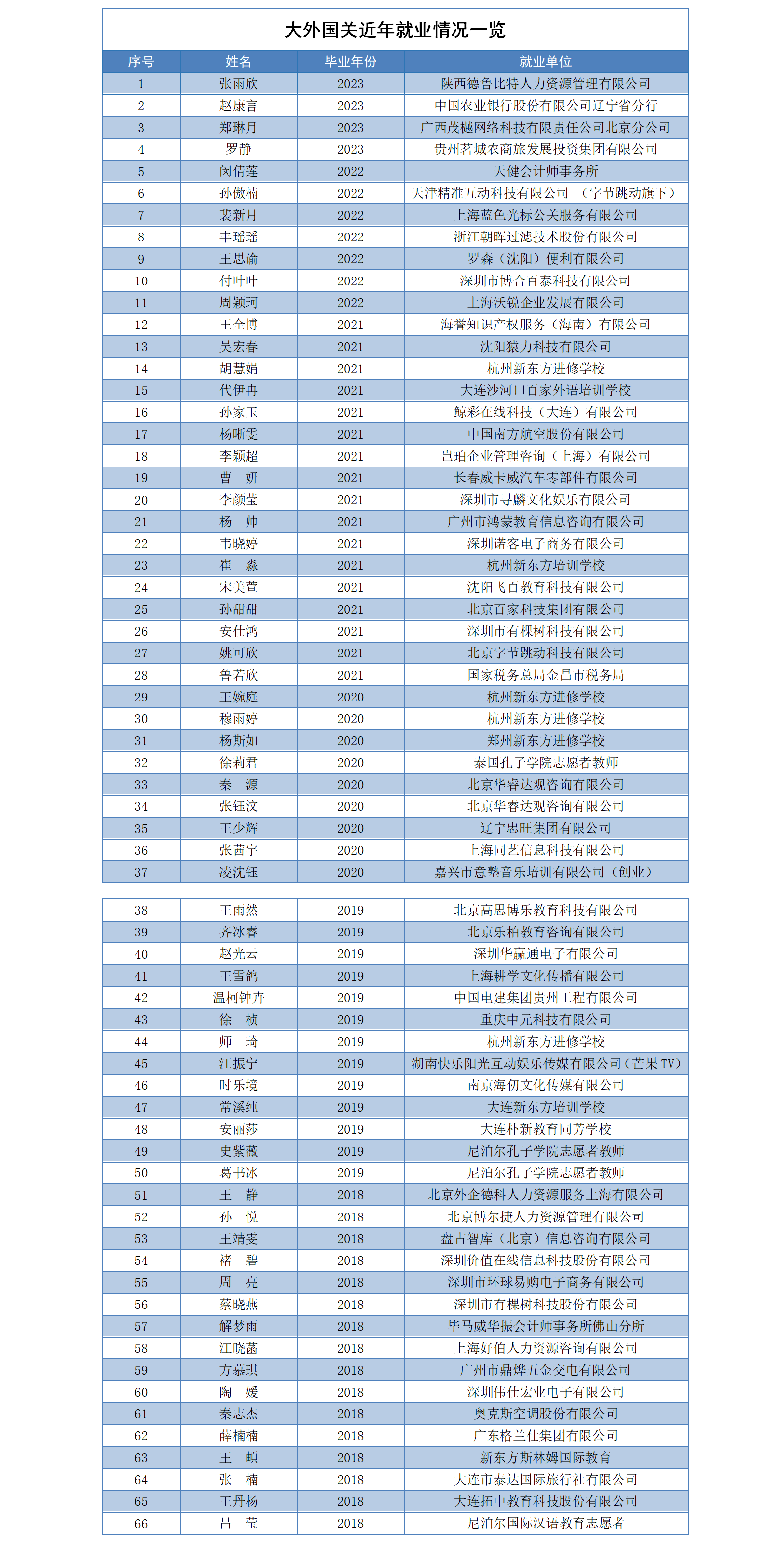 毕业生年终就业率超过95%,连续三年升学率均突破40%。多名毕业生考取北京大学、中国人民大学、同济大学、南开大学、美国乔治城大学、英国伦敦政治经济学院、日本大阪大学以及韩国首尔大学等国内外知名高等学府;毕业生的主要就业单位类型为国家机关、外事、外经外贸、外资、合资企业,如中央电视台、中国电建集团、中国南方航空集团有限公司、字节跳动等单位。