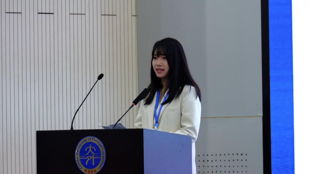 辽宁大学李冰珂同学代表参赛选手发言。他提到,青年学子肩负着国家发展的历史重任,外交事务是国家主权的重要体现,外交外事工作需要年轻一代有扎实的理论基础,敏锐的洞察力,良好的沟通能力,强烈的责任感和使命感。
