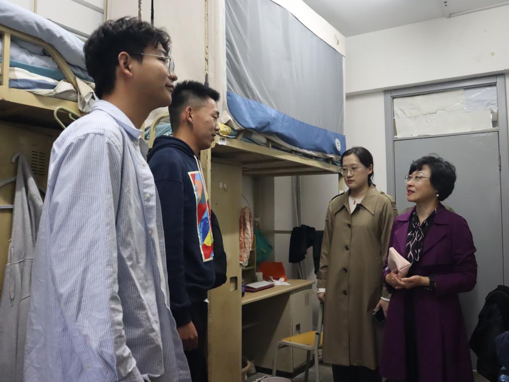 党总支书记郝利群和辅导员毕如一对2024级本科生和研究生寝室进行走访。