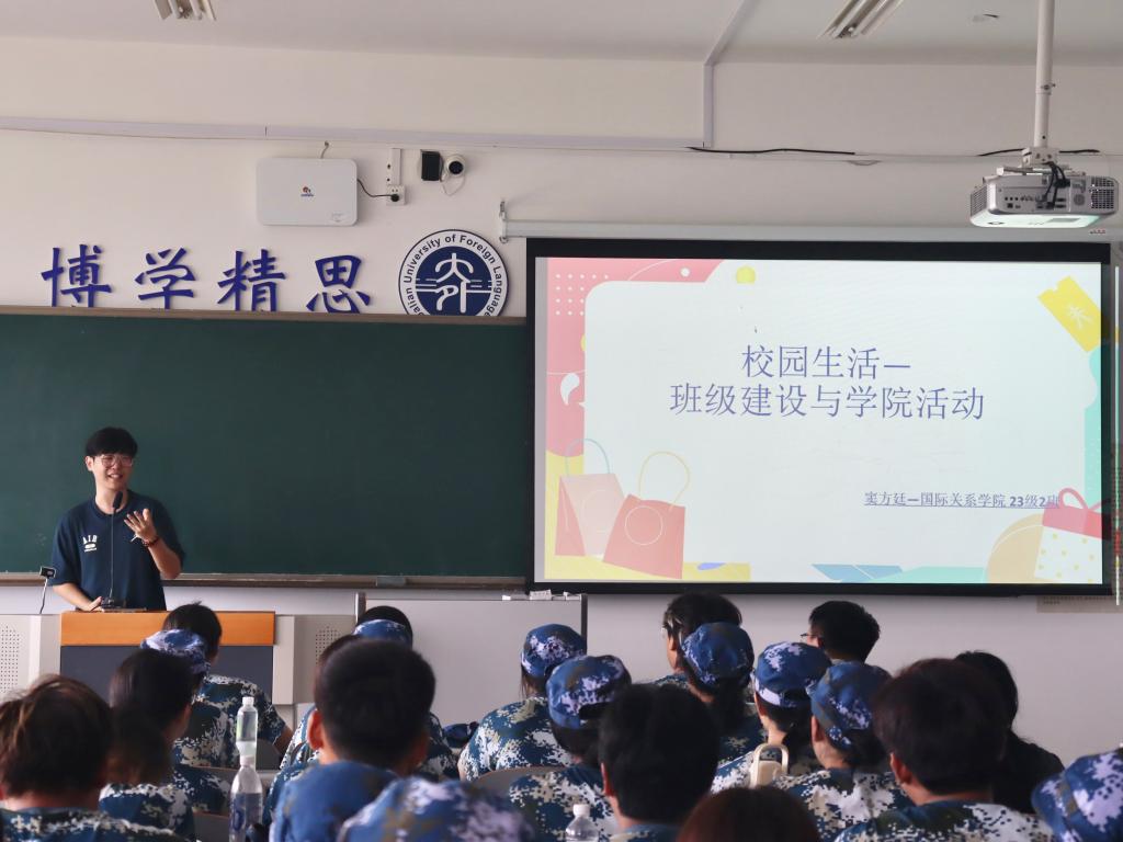 窦方廷侧重班级建设与学院活动方面的分享。班级建设方面,明确班长、团支书、学习委员等岗位的工作重点,强调全体同学需积极参与班级建设,及时关注通知、配合完成任务;学院活动方面,介绍学院特色的专业比赛、学术讲座与志愿活动,强调英语学习在专业中的重要性,鼓励新生结合自身兴趣参与学院活动,提升英语能力与专业认知。