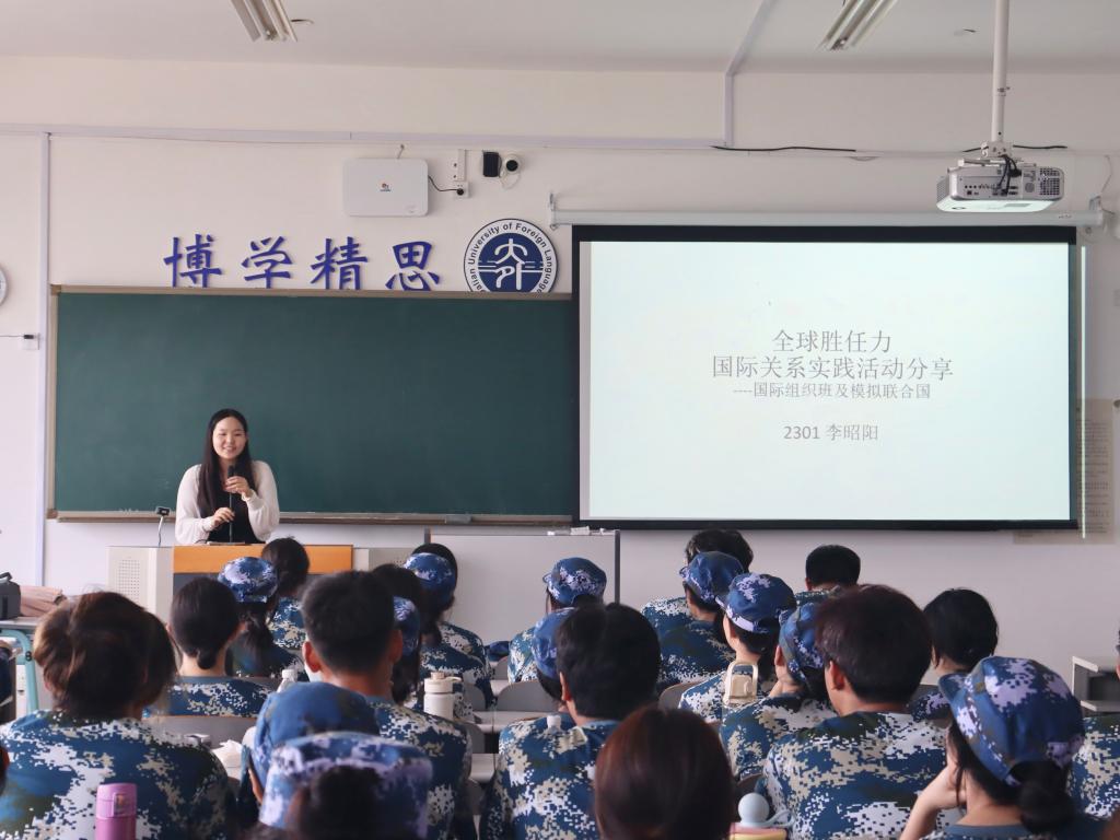 模拟联合国协会与国际组织实验班相关内容。她从自身经历出发,分享参与模拟联合国会议、全球胜任力大赛、中外人文交流项目的体会与感悟,鼓励新生积极参与课外相关学术活动,通过不同平台拓展视野、提升专业素养。
