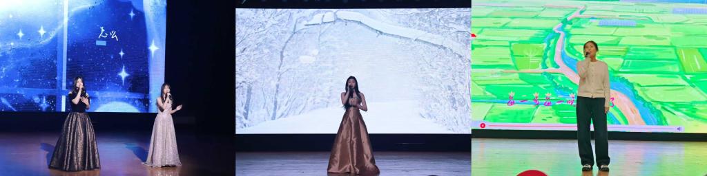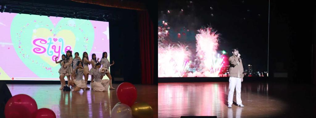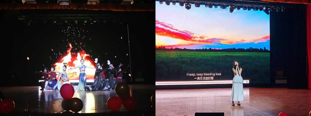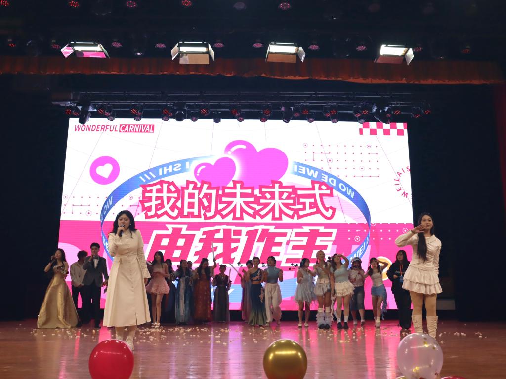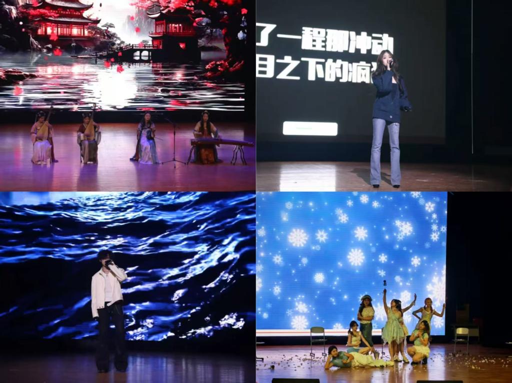 《寄明月》的弦语寄情将古风与韵律完美融合,婉转的歌声勾勒出浪漫意境;《怎么说我不爱你》的摇滚呐喊铿锵有力,释放青春的热烈与张扬;《亚特兰蒂斯之心》的说唱演绎节奏鲜明;国语歌曲串烧温情满满,唤起青春的共同记忆;《Is This Love》的浪漫玫瑰氛围拉满,《我的未来式》则以励志的旋律传递对未来的憧憬,演唱时同学们一同登台,携手唱响对未来的美好期许,将晚会氛围推向顶点。