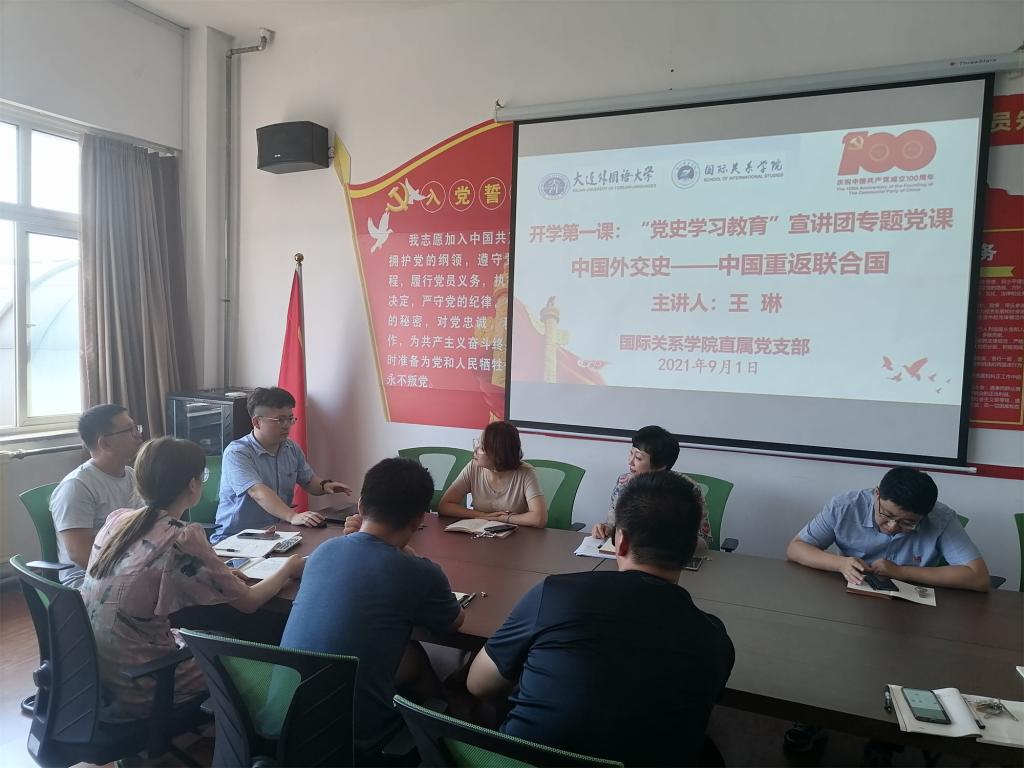 根据学校“党史学习教育”宣讲团工作计划,学院直属党支部邀请王琳老师以“外交史—中国重返联合国”为题上专题党课。党课上,王琳老师同师生党员一同回顾了中华人民共和国恢复联合国合法席位的历史。中华人民共和国恢复联合国合法席位是在外交战线上取得的一个重大胜利,是党和国家历史上的一个重要时刻。支部全体党员在学习中感到振奋,要在建设社会主义国家的新征程过程中,发挥专业特长,做好学术研究,为党和国家的外交事业做出积极贡献。