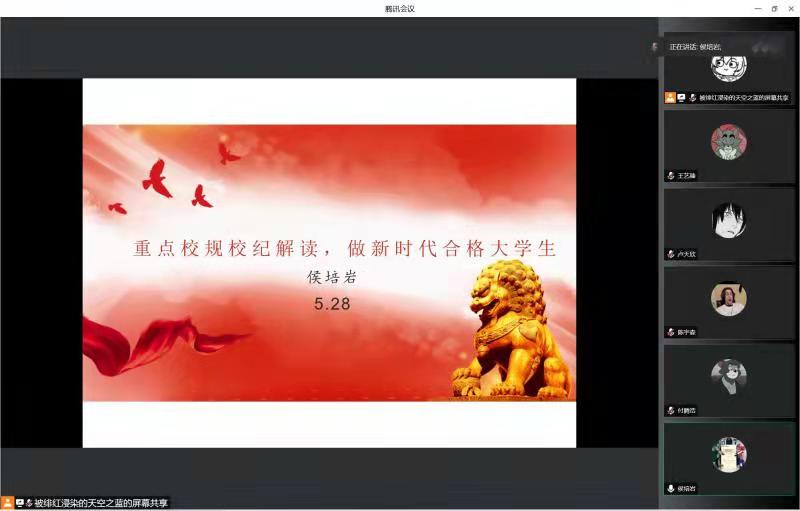 本次专题党课由三个部分组成。首先,侯培岩以“重点校规校纪解读,做新时代合格大学生”为题,重点解读了部分校规校纪,特别强调,在疫情这一特殊时期,入党积极分子要以身作则,加强自身管理,有责任、有担当,在离校季和暑假期间,坚决遵守各项防疫规定。侯培岩谈到,新时代大学生要有牢记使命、责任担当的使命感与责任感,要从自身做起,从身边事做起,让青春闪光,脚踏实地真正成为一个有责任感的青年。