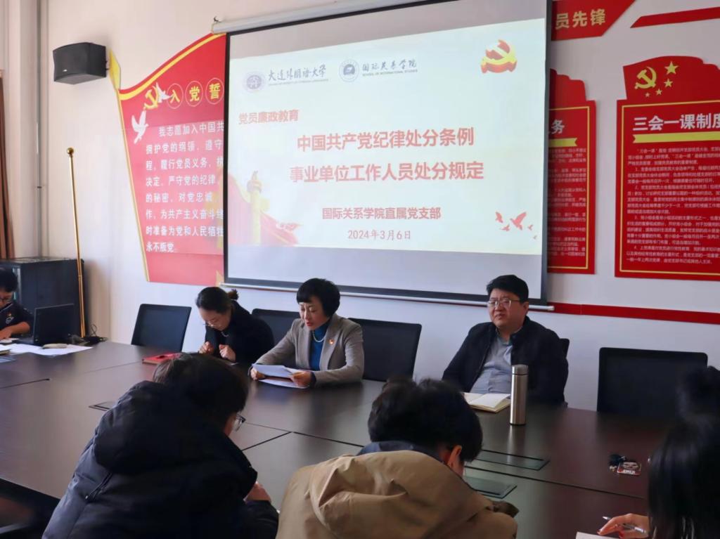 直属党支部副书记兼院长薛晓芃组织开展党员廉政教育。她带领全体党员及积极分子共同学习了《中国共产党纪律处分条例》和《事业单位工作人员处分规定》,使党员及积极分子明确纪律要求、强化纪律意识,充分认识全面从严治党的思路和举措,内化于心、外化于行。