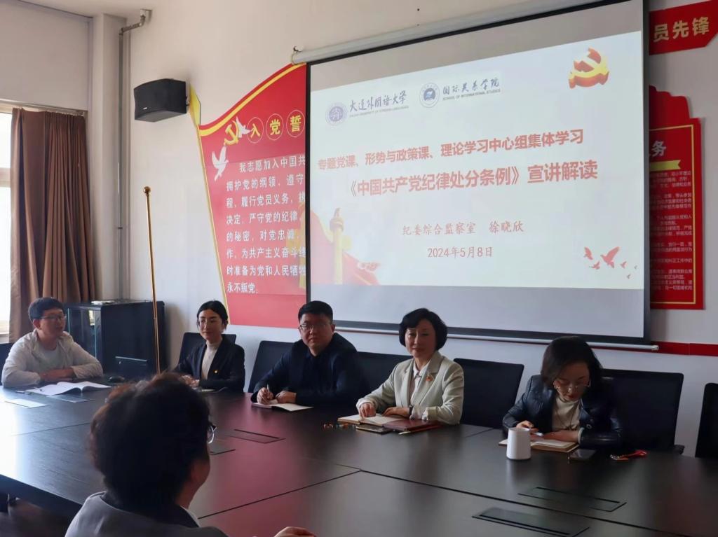首先,纪委综合监察室纪检员徐晓欣上专题党课、形势与政策课、理论学习中心组集体学习对《中国共产党纪律处分条例》宣讲解读。她分别从党纪处分条例的历史沿革、《条例》的内容结构、总则部分的应知应会、违反组织纪律的处分四方面对《条例》进行解读。她强调,《条例》总则部分的重要性不容忽视,强调违法与犯罪的区别,并围绕相关违纪案例开展警示教育,以案说德、以案说纪、以案说法、以案说责。