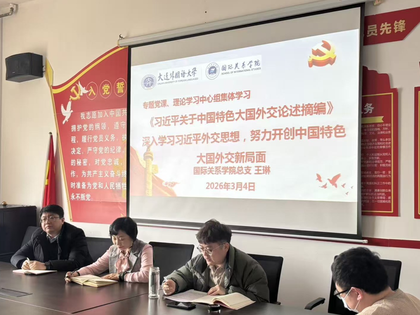 在理论学习中心组集体学习中,教工党支部书记、副院长王琳以“《习近平关于中国特色大国外交论述摘编》—深入学习习近平外交思想,努力开创中国特色大国外交新局面”为题上专题党课。他结合《习近平关于中国特色大国外交论述摘编》,从坚持党的领导、明确核心使命、高举构建人类命运共同体旗帜、推进理论与实践创新四个维度,深刻阐释了习近平外交思想的核心内涵,并结合实际工作,对学院未来建设方向进行了展望。号召全体党员以专业所学助力民间外交,为中国特色大国外交贡献青春力量。
