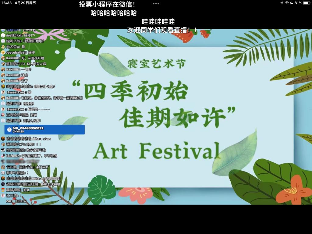 举办“四季初始,佳期如许”线上寝室艺术节,通过线上直播的方式进行。午夜影院