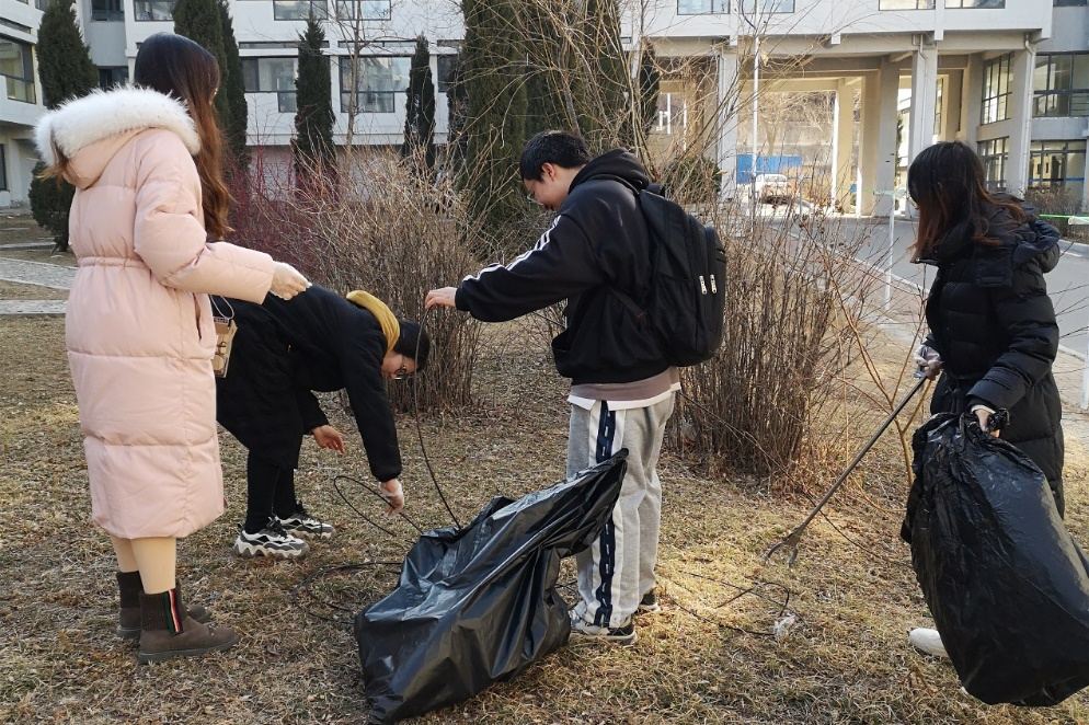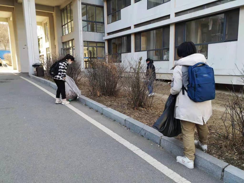 在学生党员的带领下,学生志愿者被分为五个小组。小组成员穿梭于宿舍楼之间,清理宿舍楼周围的废弃塑料袋、废纸、装修废料、烟头等垃圾,并将被风吹落的毛巾被单拾起,重新挂在晾衣绳上。大家在志愿服务中互帮互助,配合默契,高效地完成了清扫任务,展现了国关学子不辞辛劳、无私奉献、团结一致的优良精神风貌。