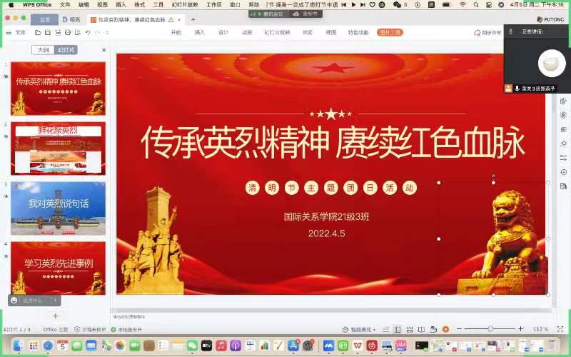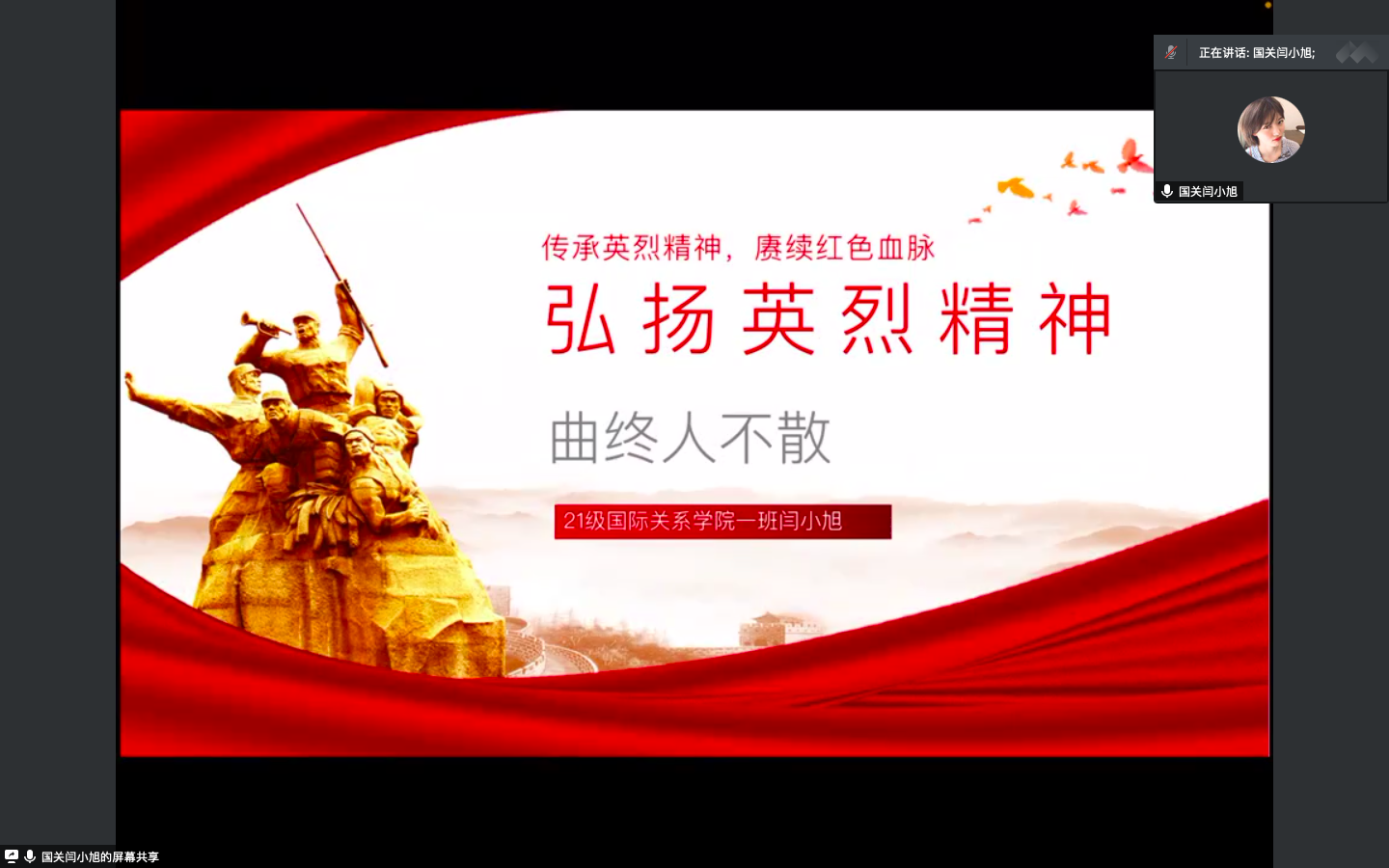 随后,参会学生对如何更好地传承英烈精神交流了观点。本次会议营造了缅怀英烈的浓厚氛围,帮助同学们了解革命先烈的光辉事迹,认识到传承英烈精神的重要性,同时也启发同学们要珍惜幸福生活,更好地将英烈精神作为向导,不断奋进。