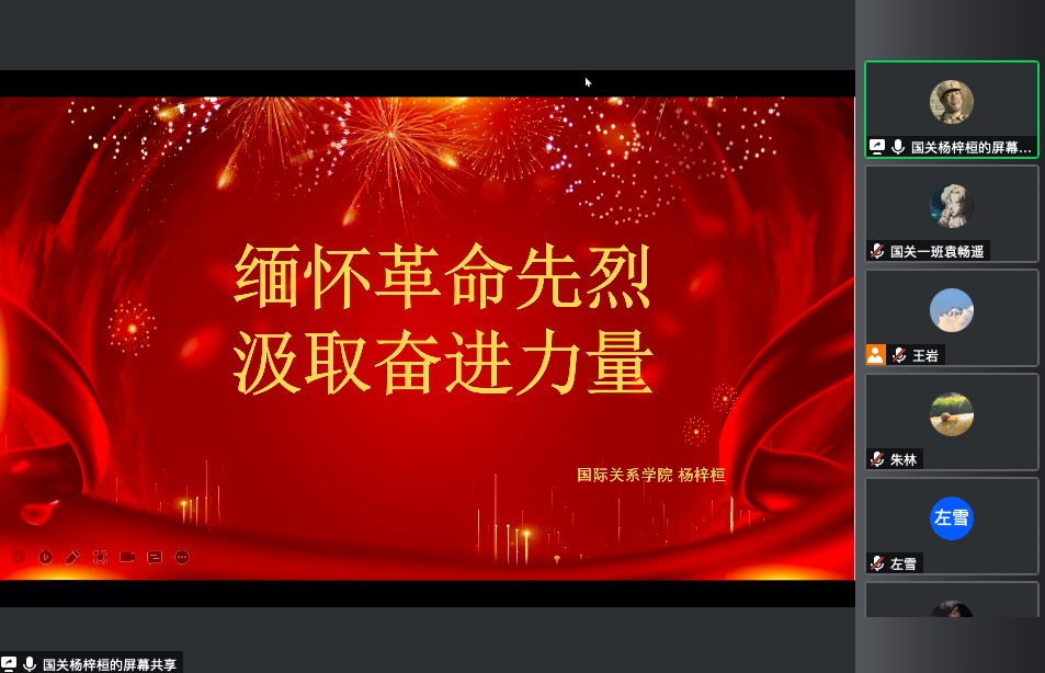 各班同学在团支书的带领下开展“云端祭英烈”活动,深切缅怀革命先烈,学习英烈光辉事迹,厚植爱党、爱国、爱社会主义的情感,铸牢中华民族共同体意识。此次活动在引导广大学生自觉肩负时代重任同时鼓励同学们做弘扬爱国主义的时代先锋,将红色基因代代相传。