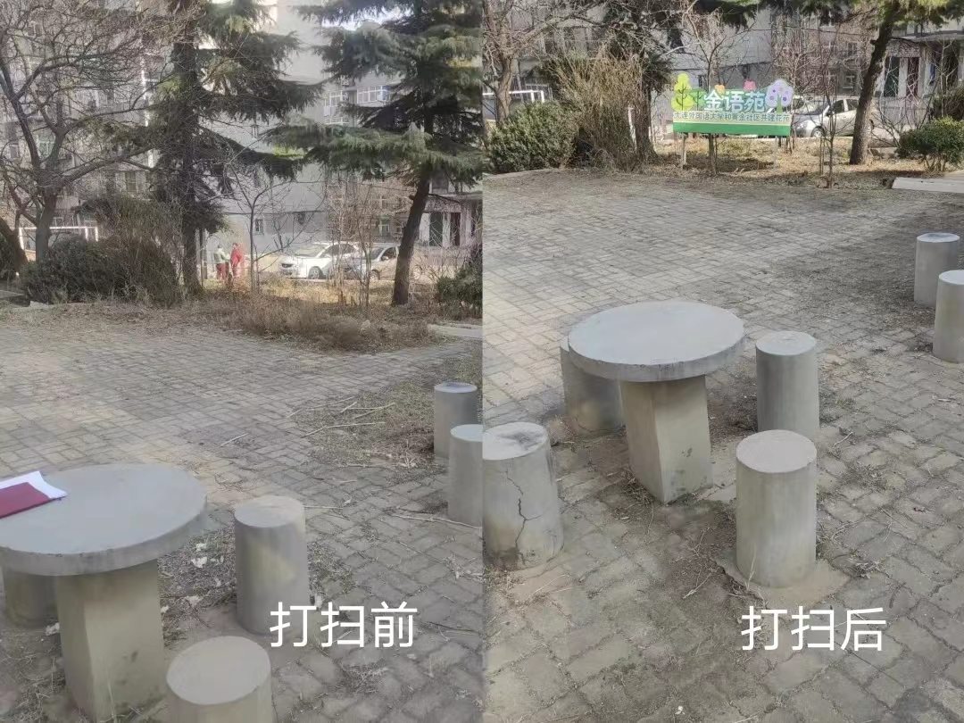 随后,两院师生到达“金语苑”废旧庭院开始社会实践。从分发清扫工具到开始清扫工作,从铲除杂草到修剪残枝,从捡拾垃圾到归拢碎屑,师生始终保持着昂扬的斗志,丝毫不在意扬起的尘土,用实际行动弘扬志愿服务精神,展现出新时代青年的责任与担当。