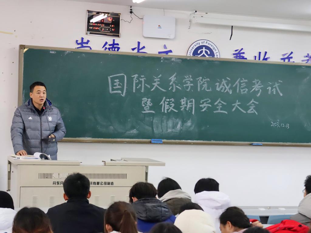 侯培岩着重强调学生的诚信问题。考试方面,他重申考试各项规章制度,详细介绍考试违规和作弊行为的处罚办法,着重指出考试违规违纪行为后果的严重性,要求全体学生诚信应考;要求学生严守学术诚信,杜绝学术抄袭。同时,他提醒学生备齐考试相关物品、做好考前准备。