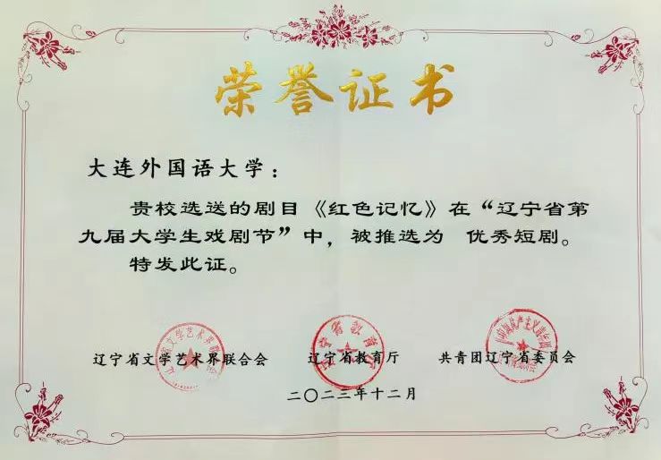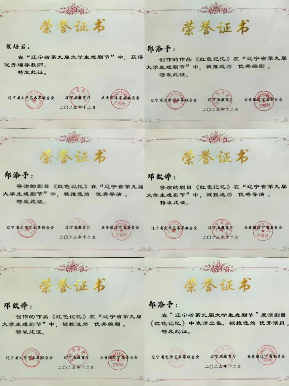 辽宁省第九届大学生戏剧节由辽宁省文学艺术界联合会、辽宁省教育厅、共青团辽宁省委员会共同主办。戏剧节于2023年4月启动,11月完成展演。紧紧围绕全面贯彻落实党的二十大精神和辽宁全面振兴,以戏剧的形式讴歌党、讴歌祖国、讴歌人民、讴歌英雄。提倡以“向真、向善、向美、向上”的精神风貌,积极创作展示时代风采、家国情怀的优秀校园戏剧作品。我校共有两部作品入围本次戏剧节决赛。
