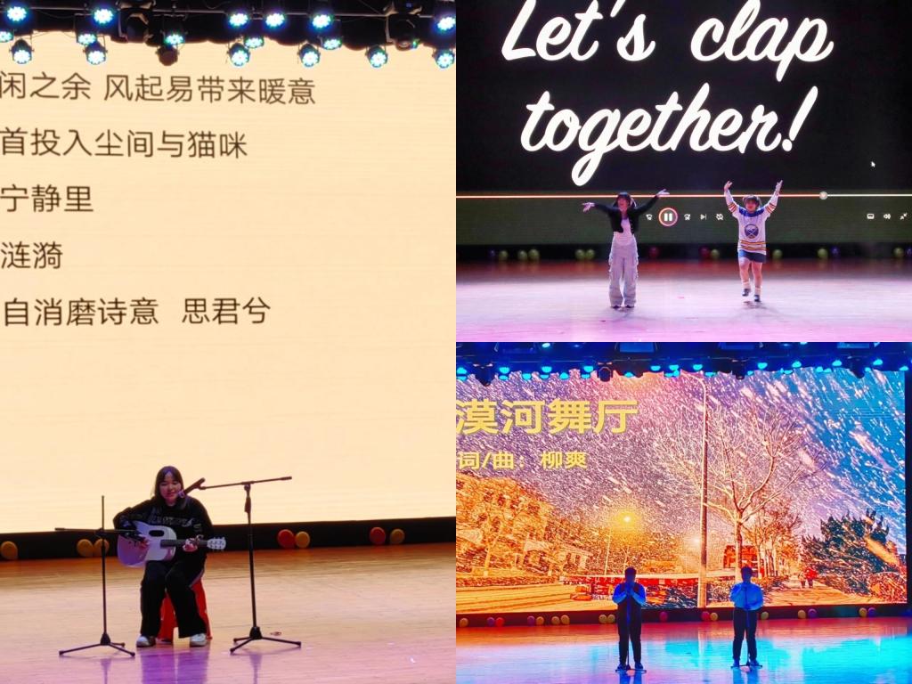 深情婉转的歌曲《倒带》、舞姿优美的拉丁舞《心跳旋律》和磅礴大气的乐器演奏《象王行》共同为在场师生献上一场美妙的视听盛宴;弹唱《唤雨》悠扬动听,歌曲《漠河舞厅》动人心弦,双人舞《antifragile+new dance+run the world》动感十足、活力四射,尽显青春风采。