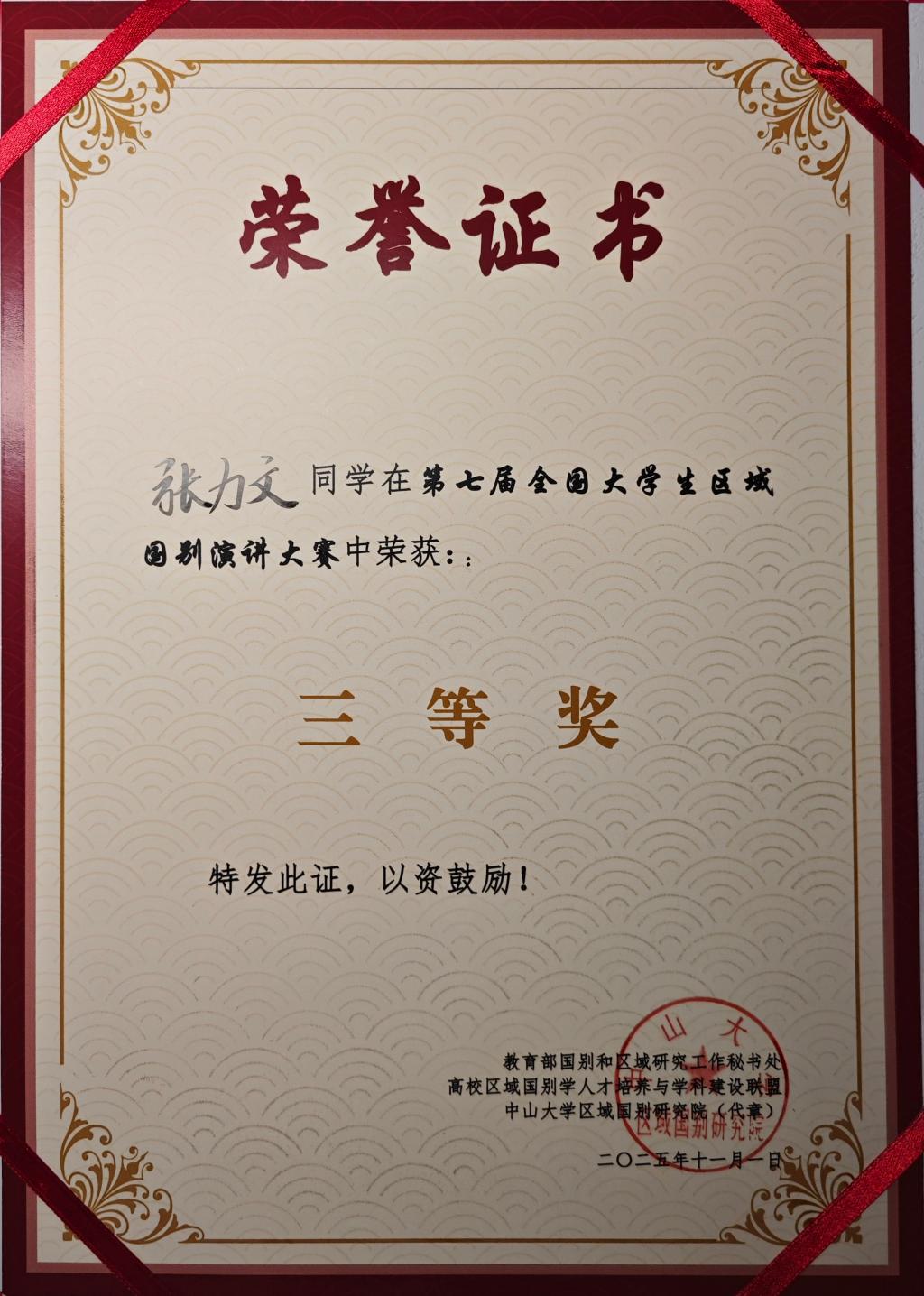 学子张力文在指导老师李晓乐的悉心指导下,凭借扎实的区域国别理论功底与临场应变能力,荣获本届大赛三等奖。