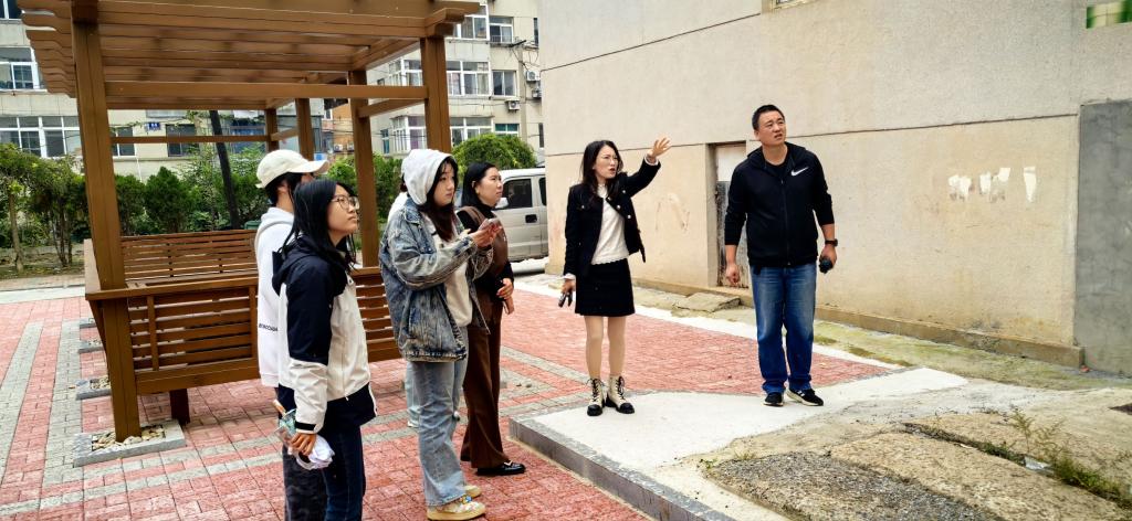 社区领导、学院老师和学生干部在绘画前考察现场