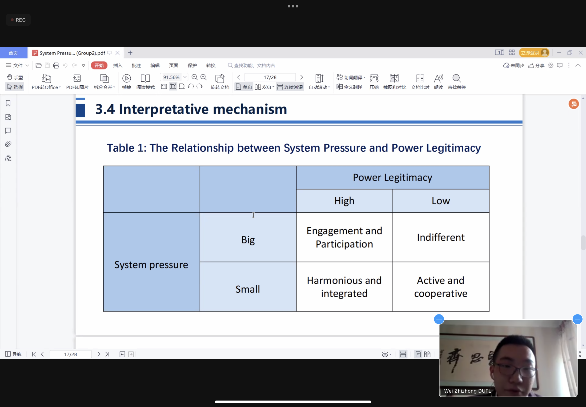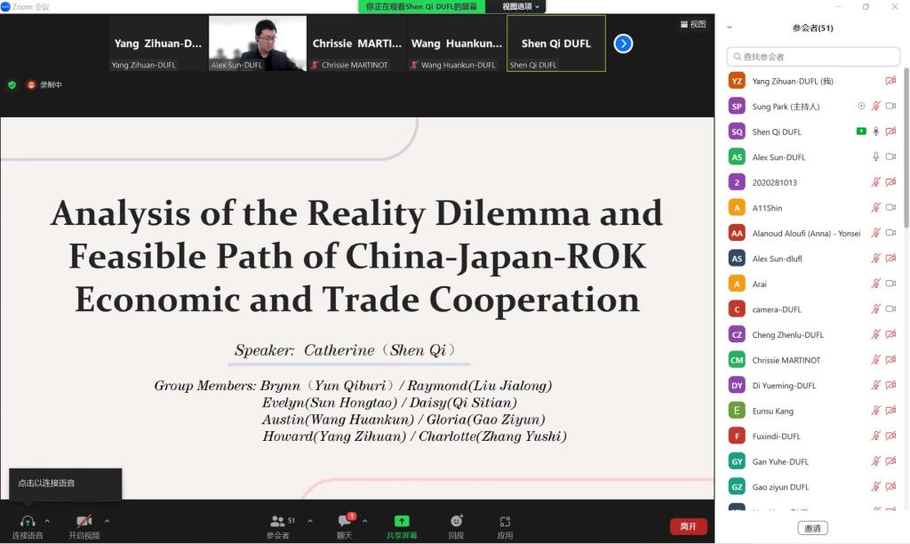 本次会议围绕东北亚地区的经济合作、地缘政治和文化交流三个议题进行小组论文展示。依据会议议程,双方院校参会学生交替进行论文展示和问答交流,对相关议题进行系统阐述和热烈讨论,同时进一步加深两国学生代表间的友谊。